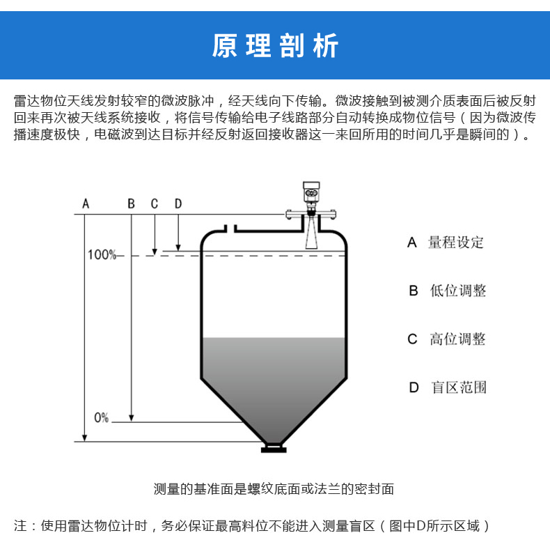 雷達(dá)液位計(jì)天線發(fā)射及窄的微波脈沖,這個(gè)脈沖以光速在空間傳播,遇到被測(cè)介質(zhì)表面,其部分能量被反射回來(lái),被同一天線接收。發(fā)射脈沖與接收脈沖的時(shí)間間隔與天線到被測(cè)介質(zhì)表面的距離成正比,多用于水位、料位與化工場(chǎng)合。